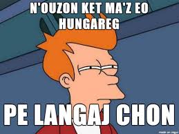 Voici la description d'un repas en langaj chon : Dom da cherchi an tag-daouzek. Traou zo war an dabletenn. Da gomañs fourmaj rouz gant un tamm hellig ha perez da laka war hoar. Goude zo hoa karn bleujer ha gregoj terran war lec'h gregoj trenk. Ur bioud char-gwin-hoc'h pe char gregoj. Evit 'chui zo ur banne kafe hag ur fistolenn char-pebr.